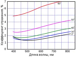 Но отражательная способность стекла, просветлённого таким способом, сильно зависит от длины волны, что является основным недостатком однослойного просветления. Минимум отражательной способности соответствует четверти длины волны в материале плёнки.