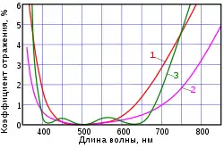Из приведённого также следует, что при толщине плёнки кратной половине длины волны наоборот происходит увеличение коэффициента отражения. Поэтому в относительно широком диапазоне длин волн для просветления наиболее эффективна четвертьволновая плёнка, так как фазовый сдвиг для соседних длин волн мал по сравнению с пространственным периодом волны. Например, пусть для одной длины волны a для другой длины волны Для первой длины волны пленка данной толщины просветляющая, для другой — отражающая. Отношение длин волн: или они различаются только на 10 %. Для приведённого примера это, например, длины волн 500 нм и 550 нм — соседние длины волн в зелёной части спектра.