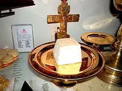Для изъятия Агнца используется просфора с особой печатью сверху в виде знака креста, разделяющего собой надпись: