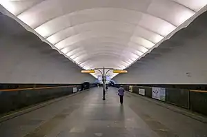 «Проспект Большевиков» — односводчатая станция глубокого заложения (глубина ≈ 68 м). Сооружена по проекту архитекторов Ю. В. Еечко, Р. Ш. Розенталя и инженера Е. В. Голубева (мастерская № 5 ЛенНИИпроекта).