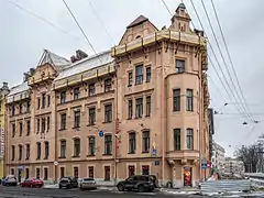 Адрес: проспект Добролюбова, дом 21А. Год постройки: 1905. Архитектор: Н. Я. Порубиновский. Архитектурный стиль: модерн.