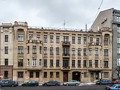 Адрес: проспект Добролюбова, дом 21. Год постройки: 1905. Архитектор: Н. Я. Порубиновский. Архитектурный стиль: модерн.