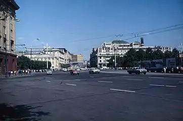 - № 7 — Гостиница «Москва» (1-я очередь: 1932—1936, архитекторы А. В. Щусев, Л. И. Савельев, О. А. Стапран; 2-я очередь: 1976, архитекторы А. Б. Борецкий, А. А. Дзержкович, И. Е. Рожин, Д. С. Солопов, В. А. Щелкановцева. Снесена в 2004 году. Отстроена заново с изменением композиции и деталей оформления по проекту В. В. Колосницына).