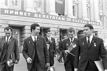 Делегаты XVI съезда ВЛКСМ выходят из здания Колонного зала Дома Союзов, 1970 год