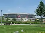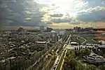 Проспект Мира, на заднем плане отель "Виктория" и Донбасс Арена, 2014 г.