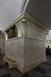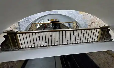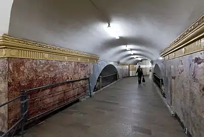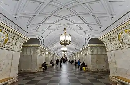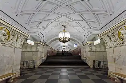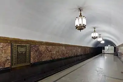 Свод оформлен выпуклыми лепными полосами, образующими сплошную ромбическую сеть. По оси свода — ряд мощных бронзовых люстр с большим числом газоразрядных ламп, в боковых залах люстры немного меньше[12]. Пол облицован серыми и чёрными гранитными плитами в шахматном порядке. Путевые стены облицованы красным мрамором с белыми прожилками[12].