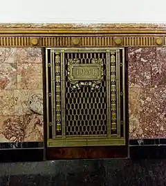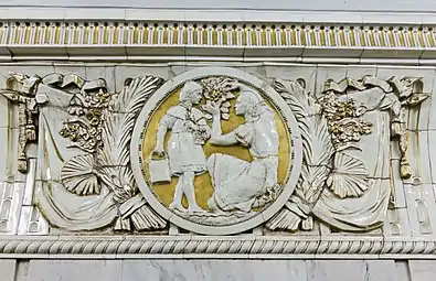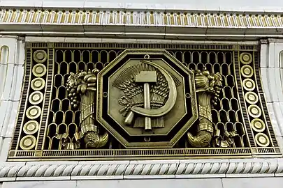 В 1953 году торцевая стена была украшена керамическом панно с изображением И. В. Сталина в окружении знамён. Панно было снято в 1958 году в связи с открытием перехода на радиальную станцию, который начинался через торец[12].