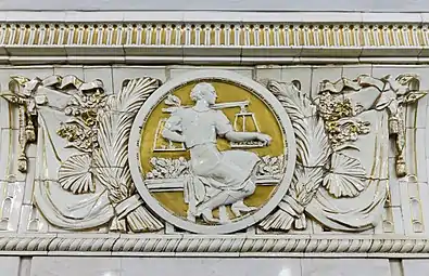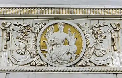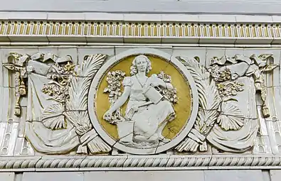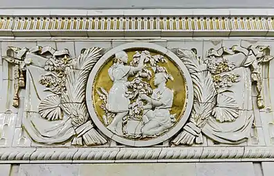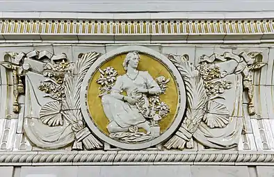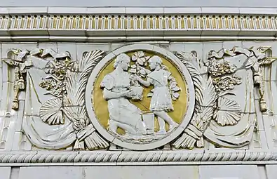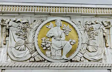 Снаружи вход и выход оформлены в виде двух больших арок, между которыми раньше, в нише, находилась скульптура «Плодородие» (скульптор Г. И. Мотовилов), изображавшая женщину с полной корзиной фруктов. При реконструкции 2015—2016 скульптура была восстановлена. Над нишей находятся оригинальные часы, украшенные барельефом с изображением мужчины и женщины. Под часами располагалась табличка с первым названием станции, которая после переименования была демонтирована, а вместо неё сделали металлические буквы на стене[12].