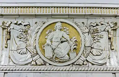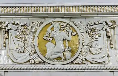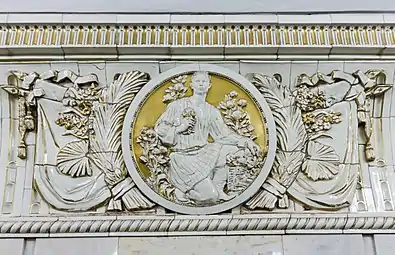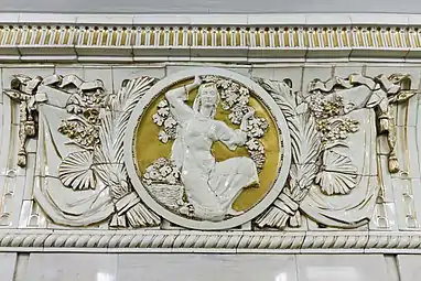 Архитектурное оформление станции посвящено теме «Преобразование природы»[12]. Массивные кубические пилоны с неширокими карнизами облицованы кремовым мрамором. Над карнизами пилонов — широкие керамические фризы, на которых изображён рельефный растительный орнамент: венки, листья, бутоны и знамёна. Они обрамляют круглые медальоны с рельефными изображениями агрономов, цветоводов, садоводов за работой. В боковых залах вместо медальонов декоративные решётки вентиляционных отверстий с колосьями, лентами и гербовыми символами[10]. Скульптор — Г. И. Мотовилов.