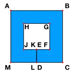 Если набор непересекающихся отрезков образует границу области на плоскости, топологически эквивалентную кругу, то эта граница называется слабо простым многоугольником[2]. На рисунке слева ABCDEFGHJKLM является слабо простым многоугольником согласно определению. Синим цветом отражена область, для которой слабо простой многоугольник является границей. Этот тип слабо простых многоугольников может возникнуть в компьютерной графике и в системах CAD в качестве компьютерного представления многоугольных областей с полостями — для каждой полости создаётся «разрез» для соединения с внешней границей. Согласно рисунку ABCM является внешней границей плоской области с полостью FGHJ. Разрез ED соединяет полость с внешним контуром и проходится дважды в представлении слабо простого многоугольника.