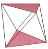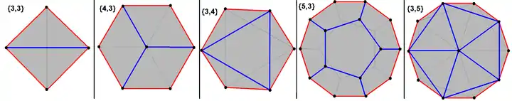 Многоугольники Петри — это правильные пространственные многоугольники, задаваемые внутри правильных многогранников и политопов. Например, 5 платоновых тел содержат 4, 6 и 10-сторонние правильные пространственные многоугольники, как видно из этих ортогональных проекций (красными отрезками показана проективная оболочка). Тетраэдр и октаэдр включают все вершины в зигзаг-многоугольника и могут рассматриваться как антпризмы отрезков и треугольников соответственно.