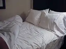 Кровать в отеле. Видны простыня и подушки