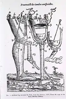Первое упоминание о протезе встречается в Ригведе, которая сообщает, что женщина-воин потеряла ногу в бою, и для неё изготовили железный протез ноги[2]. Древние египтяне были знакомы с протезированием, о чём свидетельствует мумия Нового Царства с деревянным пальцем[3]. Долгое время протезирование развивалось слабо. Знаменитые пиратские крюки и деревянные ноги — ранние формы протезов.