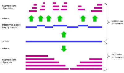 Из-за особенностей изотопного разделения пики в спектрах больших белков чрезвычайно сложно анализировать. По этой причине перед исследованием их с помощью фермента трипсина разрушают на пептиды массой 500—2500 Да, и затем по данным для пептидов восстанавливают информацию об исходном белке подобно тому, как при секвенировании нуклеиновых кислот нового поколения исходные последовательности собираются из коротких прочтений. Этот подход называется «протеомикой снизу вверх» (англ. bottom-up). Процесс сборки небезошибочен и приводит к большим потерям информации, поэтому в некоторых случаях исследуются целые белки без расщепления с помощью мощных детекторов сверхвысокого разрешения («протеомика сверху вниз», англ. top-down)[22].