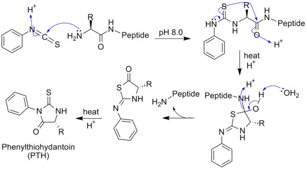 В 1950-х годах шведский химик Пер Эдман изобрёл метод определения аминокислотной последовательности белков (секвенирование). Первый этап секвенирования по Эдману — обработка исследуемого пептида изотиоцианатом фенила, который взаимодействует с аминогруппой, давая фенилтиокарбомоильный радикал. При умеренном закислении раствора он отщепляется, захватывая вместе с собой N-концевую аминокислоту. В результате в раствор выходит тиазолинон с радикалом, специфичным для данной аминокислоты. Это производное анализируют хроматографически, определяя, какая аминокислота была на N-конце, и цикл повторяется. Если исследуемый белок закреплён на твёрдой подложке, то после каждой обработки изотиоцианатом фенила его можно промывать, удаляя тиазолинон с N-концевой кислотой, и начинать новый цикл. Метод Эдмана позволяет с высокой точностью определять последовательность длиной до 30 аминокислотных остатков. Высокая чувствительность метода также позволяет секвенировать менее 0,1 нмоль пептида с 99 % точностью. Длина полипептидной цепи, которую можно секвенировать методом Эдмана, зависит от эффективности отдельных стадий, которая, в свою очередь, определяется аминокислотным составом полипептида[7].