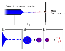 В качестве альтернативы MALDI ионизацию пептидов перед масс-спектрометрией можно осуществлять с помощью метода ионизации электрораспылением, или ионизации электроспреем (англ. electrospray ionisation, ESI). Жидкость, содержащая исследуемые белки, помещается в конический капилляр, а когда она выходит из капилляра, к ней прилагается сильное напряжение. В результате жидкость превращается в аэрозоль, и при испарении частиц аэрозоля в потоке инертного газа заряд может переходить на растворённые в аэрозоле биомолекулы, в том числе белки. При таком способе ионизации биомолекулы не разрушаются. Ионизацию электроспреем можно легко совместить с высокоэффективной жидкостной хроматографией: поток хроматографической фазы с колонки можно направить прямо в капилляр для электрораспыления. Таким образом, масс-спектрометр будет определять массы разделяемых в аналитической колонке молекул. Этот метод обозначают аббревиатурой LC-MS (от англ. англ. liquid chromatography – mass spectrometry)[26]. Идентификация белков в сложном растворе при помощи комбинации масс-спектрометрии и высокоэффективной жидкостной хроматографии получила название протеомики-дробовика, или скорострельной протеомики (англ. shotgun proteomics)[27].