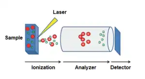 Масс-спектрометрия включает ряд методов, которые направлены на определение молекулярной массы исследуемых соединений. Она нашла широкое применение и в биологии, в особенности в протеомике. При применении масс-спектрометрии сначала белки, находящиеся в образце, ионизируют, потом в условиях вакуума ионы сортируются и детектируются, давая на выходе спектр, который дальше анализируется специальными вычислительными методами. В конечном итоге для каждого иона определяется значение отношения массы к заряду. Если заряд иона равен единице, то отношение численно равно его молекулярной массе. Поначалу использование масс-спектрометрии в биологии было ограничено из-за того, что ионизация была очень жёсткой и приводила к разрушению молекул. В 1980-х годах был разработан метод ионизации молекул лазером при их сокристаллизации со светочувствительным органическим веществом (его называют матрицей). Матрица окружает молекулы исследуемого вещества и под действием лазера ионизирует соседние молекулы. В некоторых условиях ионизацию можно провести без разрушения исследуемых молекул. Этот метод получил название опосредованная матрицей лазерная десорбция-ионизация (англ. matrix-assisted laser desorption ionisation, MALDI). Новый метод ионизации совместили с обычным масс-спектрометрометрическим детектором (времяпролётным, англ. time-of-flight, TOF). В этом детекторе ионы движутся в вакуумной трубке и достигают чувствительной пластины (фотоэлектронного умножителя), которая и является детектором. Время, за которое ион преодолевает длину трубки, обратно пропорционально его массе. В 1990-е и в начале 2000-х годов метод MALDI-TOF очень активно использовался для исследований белков[20][21].
