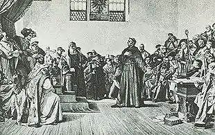 Лидером религиозной революции стал Мартин Лютер. Первое открытое выступление Лютера против церковной политики состоялось 17 октября 1517 года, когда он обнародовал 95 тезисов с критикой учения католической церкви о торговле индульгенциями, чистилища, молитв за умерших и спасения заслугами святых. Среди прочего, им были отвергнуты папская власть, особая благодатность священства и его посредничество в спасении людей, церковная обрядовость и подчинённость Церкви светской власти[3].