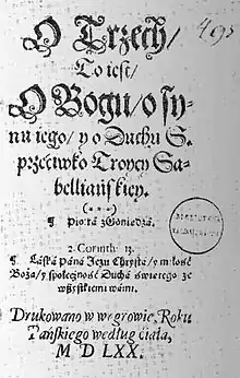 Антитринитарии (отрицающие Троицу) не признавали большинство церковных обрядов и догматов, схоластическую философию и теологию, критиковали утверждения Библии (бессмертие души, загробный мир и др.), библейские чудеса. Признавали только единого Бога. Учение возникло в начале IV века, его проповедовал Арий, осуждённый I Вселенским собором в 325 году. Возобновили учение братья Фауст и Лелио Социны. В отличие от Лютера они считали, что Священное Писание как единственный источник вероучения приемлемо лишь в том случае, когда оно не противоречит разуму[86]. От их имени последователей стали называть социнианами. Братья приехали в Польшу, где учение получило название антитринитаризм. Их ученики итальянцы Джорджио Бландрата и Франциск Станкаро, подляшский уроженец Пётр из Гонёндза принесли учение в Литву[87][88][89] Станкара, который был автором известной еврейской грамматики «Ebr. grammaticae institutio» (Базель, 1547), пригласил Сигизмунд II Август преподавать еврейский язык в Краковском университете. Но в итоге Станкар оказался в тюрьме, а Петра из Гонёндза по настоянию Николая Радзивилла Чёрного вызвали в 1558 году на виленский кальвинистский собор дать отчёт о своей деятельности, поскольку новое учение литовским магнатам не очень-то нравилось[90][91]. Брестский пастор Симон Зациус из Прошовиц выпустил в 1559 году «Исповедание веры збору виленского» с изложением основ кальвинизма и обличением антитринитариев.
