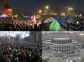 Протесты начались 20 февраля, к 21 февраля сообщалось уже о 25 000 сторонниках оппозиции, присутствующих на митинге. Тер-Петросян заявил, что армия не будет действовать против демонстрантов, которые заявили о поддержке двух заместителей министров обороны. Помощник Тер-Петросян пообещал, что протесты будут продолжаться «безостановочно», и потребовал, чтобы правительство согласилось на проведение перевыборов 22 февраля.[3] 21 февраля два члена Центральной избирательной комиссии, которые являлись представителями оппозиции заявили, что они не признают результаты, и на следующий день, Ваан Ованнисян (кандидат от партии Дашнакцутюн) подал в отставку со своего поста вице-спикера Национального Собрания Армении из-за неодобрения обработкой выборов и заявил, что механизмы фальсификаций были введены в эксплуатацию ещё в 1996 году Тер-Петросяном.[4] Протесты продолжались 22 февраля, и заместитель Генерального прокурора Гагик Джангирян осудил выборы, призвав народ немедленно принять меры для защиты своих голосов, а позднее, раскритиковал действия властей. Кочарян попросил Генерального прокурора Агвана Овсепяна уволить Джангиряна[5]. По словам Тер-Петросяня двое заместителей министра обороны заявили, что не допустят использование армии против протестующих. Министерством обороны это утверждение Тер-Петросяна было опровергнуто.