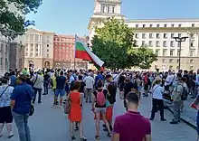 Акции протеста начались 9 июля 2020 года. Демонстранты поставили целью устранение кабинета Борисова и отставку генерального прокурора Ивана Гешева. Несмотря на пандемию Covid-19, сотни тысяч людей по всей стране присоединились к протестам.[49] Их поддержал президент Румен Радев, который призвал к изгнанию мафии из исполнительной власти и прокуратуры, а также потребовал от государств-членов ЕС выразить позицию по ситуации в стране, которая перерастает в конституционный кризис. Партия ГЕРБ организовала контрпротест в поддержку кабинета министров, для чего организованные протестующие были доставлены со всей страны на автобусах. Контр-митинг проходил в непосредственной близости от протестов, что создало условия для массовых беспорядков. Некоторые протестующие применили насилие к участникам митинга[50] что спровоцировало действия правоохранительных органов, которые задержали некоторых демонстрантов.[51] Во время задержания произошли столкновения с полицией, в результате которых были раненые. Двое демонстрантов были доставлены в больницу после того, как были избиты полицией и впоследствии скованы наручниками в Пирогове.[52][53] Задержанную девушку жестоко тащили за волосы, а затем её оскорбляла полиция, и эти случаи были скрыты властями.[54][55] Однако премьер-министр и генеральный прокурор отказались уйти в отставку.[56][57] Прокуратура и члены правительства выступают против отставки главного прокурора и премьер-министра.[58]