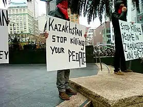 Пикет против разгона бастующих в Жанаозене прошёл в Лондоне около казахстанского посольства[90].