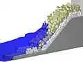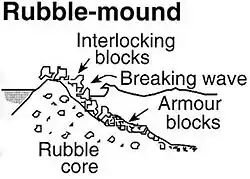 - Насыпные дамбы — используются для ситуаций с меньшей энергией волн и эрозионного воздействия, в некоторых случаях не обеспечивают гидроизоляцию и позволяют проход воды после разрушения волны.[11]