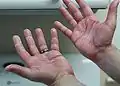 Руки пациента примерно через десять дней химиотерапии капецитабином с признаками эритемы средней тяжести