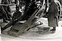 - Противооткатные устройства смонтированы в корытообразной люльке под стволом. Люлька с цапфами с роликовыми подшипниками лежит в цапфенных гнёздах верхнего станка и сектором сцепляется с валом подъёмного механизма. При откате противооткатные устройства оставались неподвижны.
