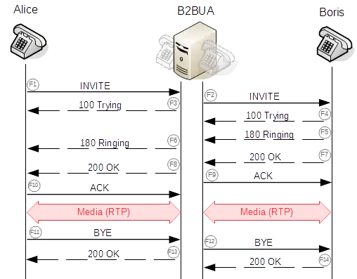 В примере ниже медиатрафик проксируется через сервер. Сигнальные сообщения для участков Алиса — B2BUA и B2BUA — Борис являются полностью независимыми и выполняются в рамках разных сессий (изменятся как минимум адреса назначения и отправка, а также Call ID сессий). Терминал Алисы не знает реального местоположения терминала Бориса и наоборот. Так может выглядеть взаимодействие через некоторые софтсвичи или пограничные контроллеры сессий (SBC).
