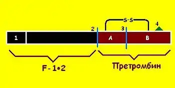 Действие протромбиназного комплекса направлено на протромбин (II фактор свёртывания). Молекула протромбина представляет собой одноцепочечный гликопротеид с молекулярной массой 72 кД. В ней имеется N-концевой участок (свободная аминогруппа) и C-концевой участок (свободная карбоксильная группа). N-концевой участок молекулы содержит γ-карбоксиглутамат, с помощью которой протромбин через ионы кальция прикрепляется к поверхности тромбоцита. Протромбин состоит из двух половин: F-12 (не войдёт впоследствии в состав тромбина) и претромбина (составляет основу будущего тромбина).