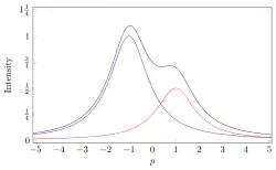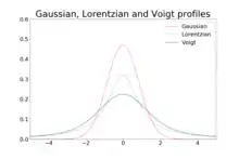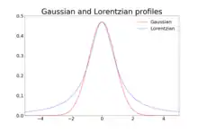 где — частота линии, — ширина на полувысоте для лоренцевского профиля, — сдвиг линии. При прочих равных условиях, лоренцевский профиль имеет более резкий максимум и более выраженные крылья, чем гауссовский[5][12][13].