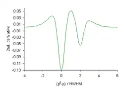 Вторые производные, , для функций Гаусса и Лоренца имеют уменьшенную ширину на полувысоте. Это можно использовать для улучшения спектрального разрешения. На диаграмме показана вторая производная чёрной кривой на диаграммы выше. В то время как меньший компонент даёт плечо в спектре, он появляется как отдельный пик во 2-й производной[комм. 1]. Четвёртые производные, , также можно использовать, когда отношение сигнал/шум в спектре достаточно велико[43].