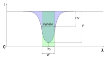 Ширина линии на полувысоте, иногда называемая полушириной — это разность между длинами волн или частотами, на которых интенсивность излучения или глубина линии составляет половину от максимальной. Этот параметр обозначается как . Область линии, находящаяся внутри ширины на полувысоте, называется центральной частью, а области, находящиеся по сторонам ― крыльями[2][5][6].