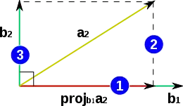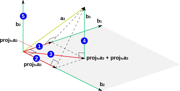 Таким образом, в процессе Грама — Шмидта для вычисления выполняется проецирование ортогонально на гиперплоскость, натянутую на векторы . Вектор затем вычисляется как разность между и его проекцией. То есть — это перпендикуляр от к гиперплоскости, натянутой на векторы . Поэтому ортогонален векторам, образующим эту гиперплоскость.