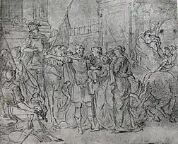 Искусствоведы также отмечают большое мастерство художника, проявленное им при создании образов воинов, изображённых сидящими и стоящими в левой части картины, которые тоже воспринимаются в качестве активных участников композиции. К ним можно отнести и всадника со знаменем, находящегося за спиной служанки[42].