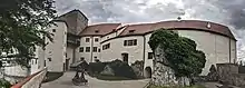 Внутренний двор замка частично вырезан в скале. С запада он был защищён высокой стеной, которая ранее была снесена в XIX веке. В северо-западной части двора находится многоугольная башня, построенная в начале XVII века. Внутренняя винтовая каменная лестница ведёт через переход к верхним этажам главного здания. Снаружи этого перехода находится герб семей фон Кёкха и фон Лерхенфельд.