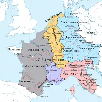 - Карл, несовершеннолетний и болезненный сын Лотаря I, получил Прованское королевство.