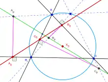 - Пусть ABC — треугольник, и пусть прямая ℓ (зеленая на рисунке) проходит через центр X3 описанной окружности, а точка P лежит на окружности. Пусть AP, BP, CP пересекают прямую ℓ соответственно в точках Ap, Bp, Cp. Пусть A0, B0, C0 представляют собой проекции точек Ap, Bp, Cp соответственно на прямые BC, CA, AB. Тогда 3 точки A0, B0, C0 коллинеарные точки, то есть лежат на одной прямой. Кроме того, проходящая через них, прямая одновременно проходит через середину отрезка PH, где H является ортоцентром треугольника ABC. Если ℓ проходит через P, то прямая совпадёт с прямой Симсона. [9][10][11]