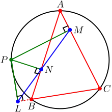 Основания перпендикуляров, опущенных из произвольной точки описанной окружности треугольника на его стороны или их продолжения, лежат на одной прямой. Эта прямая называется прямой Симсона[1].