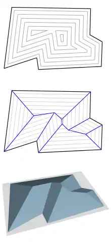Каждая точка внутри входного многоугольника может быть поднята (z-координата точки) в трёхмерном пространстве на время, за которое в процессе сокращения достигается эта точка. Получающаяся трёхмерная поверхность имеет постоянную высоту на сторонах многоугольника и поднимается под постоянным углом от них, за исключением точек самого прямолинейного скелета, где части поверхности встречаются под разными углами. Таким образом, прямолинейный скелет можно использовать как набор хребтов крыши здания, опирающейся на стены в форме начального многоугольника[1][13]. Нижняя фигура на иллюстрации показывает поверхность, полученную таким образом из прямолинейного скелета.