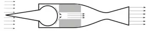 - Чем больше расход воздуха через тракт двигателя, тем выше создаваемая им тяга, в соответствии с формулой (3). Однако расход воздуха через тракт двигателя не может расти неограниченно. Площадь каждого сечения двигателя должна быть достаточной для обеспечения необходимого расхода воздуха.