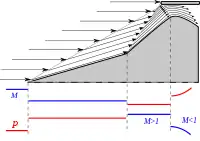 Торможение сверхзвукового газового потока происходит всегда разрывно (скачкообразно) — с образованием ударной волны, называемой также скачком уплотнения. Процесс сжатия газа на фронте ударной волны не является изоэнтропийным, вследствие чего в нём имеют место необратимые потери механической энергии, и степень повышения давления в нём меньше, чем в идеальном — изоэнтропийном процессе. Чем интенсивнее скачок уплотнения, то есть чем больше изменение скорости потока на его фронте, — тем больше потери давления, которые могут превышать 50 %.