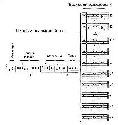 - интонация (лат. intonatio, также inchoatio) — формула начала, мелодический зачин; второй и последующий стихи псалма распеваются без интонации (распев начинается сразу с тенора);