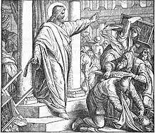 Когда Иисус изгнал из храма меновщиков, опрокинул их столы и прогнал с территории продававшихся жертвенных животных, это было не вспышкой необузданного гнева, а проявлением подлинного духовного рвения[17]. Это поступок Человека, снедаемого ревностью по Божьей славе и желающего устранить препятствия на пути надлежащего поклонения[18]. Действия Иисуса были созвучны ожиданиям той эпохи от Мессии. С учётом того, что в предшествующей части Евангелия Иисус был назван «Мессией», «Сыном Божьим», «Царём Израилевым» (Ин. 1:41, 49), неудивительно, что Его ученики вспомнили цитату из 68-го псалма[17].