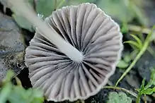 Пластинки широкоприросшие, редкие, легко отрывающиеся, при созревании меняют цвет от серого до черноватого, чёрного, с бежево-розоватым краем.