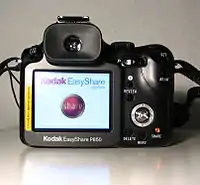 Цифровые псевдозеркальные камеры, как правило, не оснащаются оптическим видоискателем, вместо которого используется окулярный визир с малогабаритным жидкокристаллическим дисплеем (электронный видоискатель), а также отдельный жидкокристаллический дисплей. Это даёт возможность классического визирования через окуляр, наблюдая защищённое от внешней засветки беспараллаксное изображение (но не на фокусировочном экране, а на ЖК-дисплее). Размер матрицы псевдозеркальных фотоаппаратов и принцип действия практически не отличаются от компактных цифровых камер. В большинстве случаев вместо фокального затвора используется центральный, расположенный между линзами объектива. Кроме того не используется прыгающая диафрагма, поскольку яркость изображения в видоискателе не зависит от установленного относительного отверстия, а отражает соответствие правильной экспозиции. Отличия от простейших фотоаппаратов заключаются в возможности сквозного визирования через съёмочный объектив, а также в сложном интерфейсе, позволяющем регулировать большинство параметров. Небольшой размер кадра позволяет использовать встроенный «суперзум» с большим диапазоном фокусных расстояний, но небольшой светосилой[8]. Для большинства псевдозеркальных камер выпускаются широкоугольные и теленасадки, расширяющие возможности несъёмного объектива.