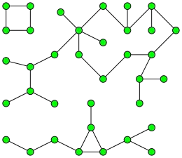 Мы определяем неориентированный граф как множество вершин и рёбер, таких, что каждое ребро содержит две вершины (возможно, совпадающие) в качестве конечных точек. То есть разрешаются кратные рёбра (рёбра с теми же конечными вершинами) и петли (рёбра, конечные вершины которых совпадают) [1]. Подграф графа — это граф, образованный подмножеством вершин и рёбер, такой, что любое ребро в этом подмножестве имеет конечные вершины в подмножестве вершин. Связная компонента неориентированного графа — это подграф, состоящий из вершин и рёбер, которые можно достичь, следуя по рёбрам, исходя из одной стартовой вершины. Граф связан, если любую вершину или ребро можно достичь, следуя из любой другой вершины или ребра. Цикл в неориентированном графе — это связный подграф, в котором любая вершина инцидентна в точности двум рёбрам или является петлёй.