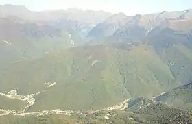 ![]() Вид на хребет Псехако с пика Чёрная пирамида, хребет Аибга. Слева внизу у подножья хребта здания и сооружения ГТЦ ОАО Газпром. | |