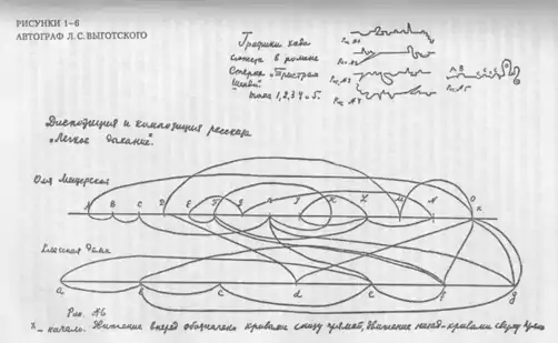 Ход сюжета в виде графиков изображает Стерн в конце своего романа «Тристрам Шенди». Но необходимо заметить, что такое оформление характерно не только для некоторой истории, рассказа, где фабулой выступают события в хронологическом порядке, но и для музыкальных произведений, стихов, где материалом являются гамма и слова, соответственно. И если данная запутанность в последних двух понятна, то в первом не совсем ясна. Почему нельзя выбрать движение из одной точки в другую - по прямой? На этот вопрос Выготский даёт ответ на примере событий, которые приведут к убийству. Если знакомство с персонажем, угрозу и убийство расположить не в прямой последовательности, то впечатление от общей картины будет различно. Можно сравнить статическую схему рассказа с анатомией, а динамику композиции с физиологией.